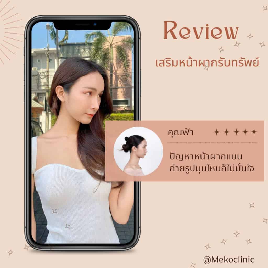 การเสริมหน้าผากด้วยซิลิโคน ช่วยทำให้ใบหน้าดูสวยและมีมิติขึ้น หน้าผากจะโหนกนูนได้สัดส่วน และสมดุลจะทำให้สันจมูกดูได้รูปน่าชวนมองมากขึ้น ถ่ายรูปมุมไหนก็ออกมาสวย หลังจากที่ฟ้าเสริมหน้าผากที่เมโกะคลินิกครบ 1 เดือน ชอบมากค่ะ ใช้เวลาพักฟื้นประมาณ 1 สัปดาห์ บวมช้ำไม่เยอะค่ะ เพื่อนๆหลายๆคนก็ทักว่าหน้าฟ้ามีความหวานละมุนมากขึ้น ด้วยความที่โครงหน้าของเราเป็นผู้ชายด้วยเลยทำให้หน้าดูแข็ง แต่หลังเสริมหน้าผาก โครงหน้าเปลี่ยนหน้าก็ดูมีความหวานและมีความเป็นผู้หญิงมากขึ้นค่ะ สำหรับใครที่มีปัญหาหน้าผากแบน หน้าผากแคบไม่มีมิติ ลองมาปรึกษากับคุณหมอเพื่อเสริมหน้าผากได้นะคะ ฟ้ารู้สึกว่าการเสริมหน้าผากตอบโจทย์ฟ้ามากๆค่ะ